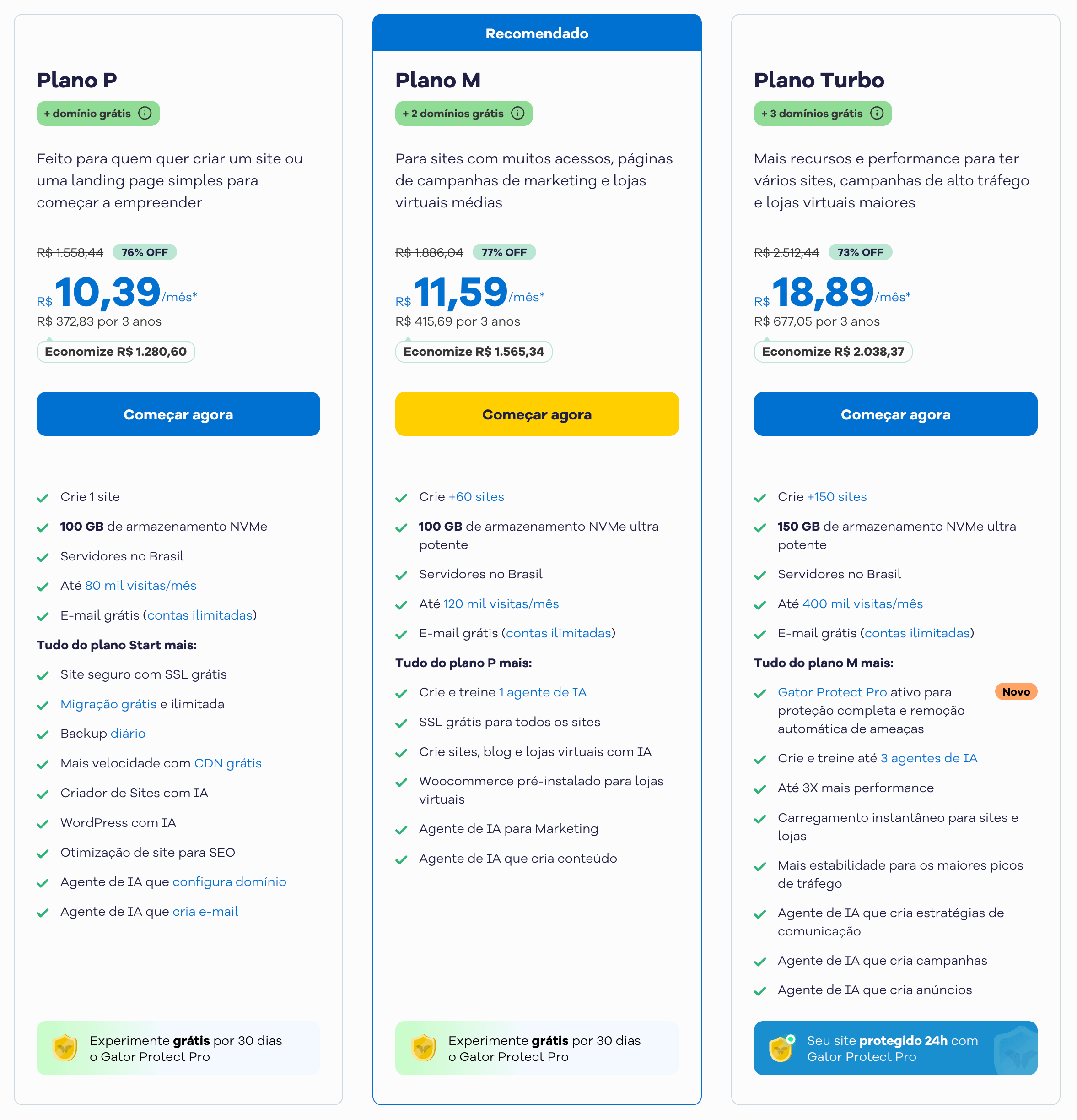 - Hospedagem P: ideal para sites institucionais, blogs ou de portfólio simples