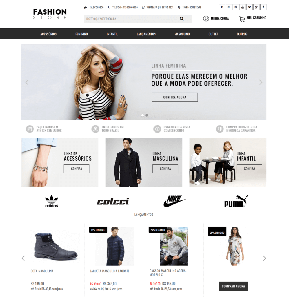 Antes de qualquer coisa, você vai notar que os itens na loja de temas da Loja Integrada são organizados por categorias de loja (moda, esportes, games, etc.). Essas categorias são meramente ilustrativas! Se a sua loja é de “Moda” e você gostou de um tema que é apresentado como um tema de “Joias e Acessórios”, não tem problema nenhum. Esses temas são apresentados dessa forma para facilitar a visualização de uma aplicação dele.