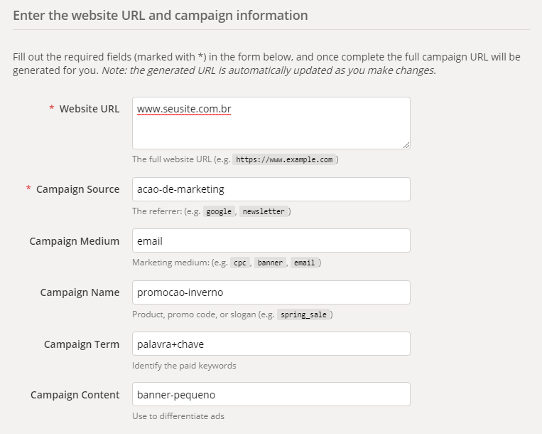 Dica: Para não ter problemas, evite preencher esse campo com acentos, espaços, maiúsculas e caracteres especiais. “Ação de Marketing”, por exemplo, deve ser escrita como “acao-de-marketing”.
