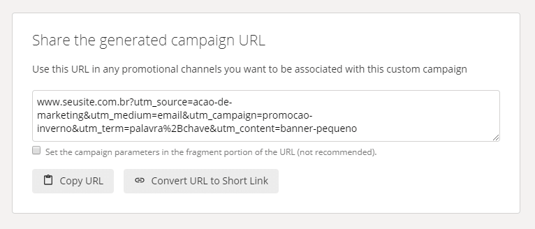 Você pode preencher apenas os campos mais importantes para você, mas recomendamos preencher pelo menos origem e mídia. Ao final, você tem a URL prontinha para copiar. Você também pode clicar em “Convert URL to Short Link” para ter automaticamente uma versão encurtada do link, ótimo para ficar mais amigável no Twitter ou no WhatsApp.
