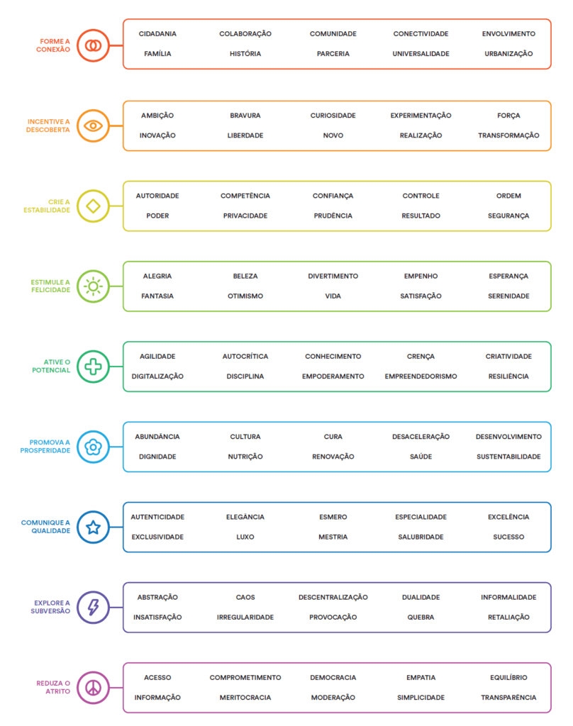 Cada marca tem valores próprios, que são características abstratas que os consumidores usam para escolher uma marca ou outra, muitas vezes sem nem perceber. Esses valores podem variar em diferentes pilares: