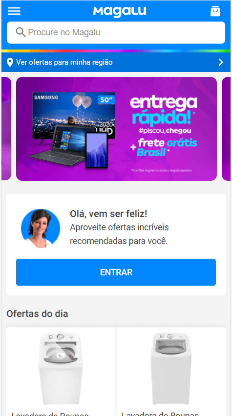 As letras miúdas do banner da Magalu não são legíveis em um celular.
