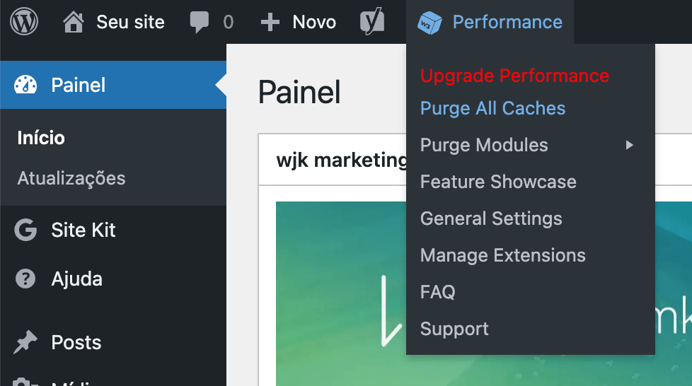 - Na barra administrativa no topo do site, encontre o item Performance