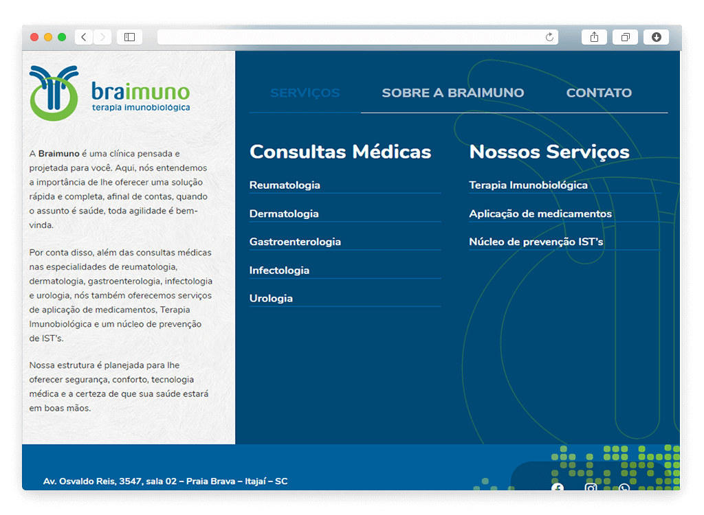 Pensando em um site simples e rápido, montamos o site da Braimuno seguindo sua identidade visual.