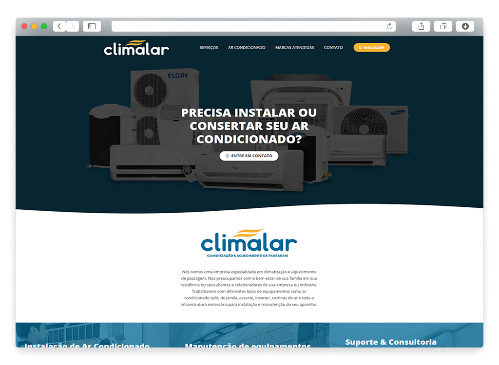 Para ter uma página profissional e começar uma presença online, criamos para a Climalar uma página rápida que descreve os serviços e ajuda a posicionar a empresa no mercado.