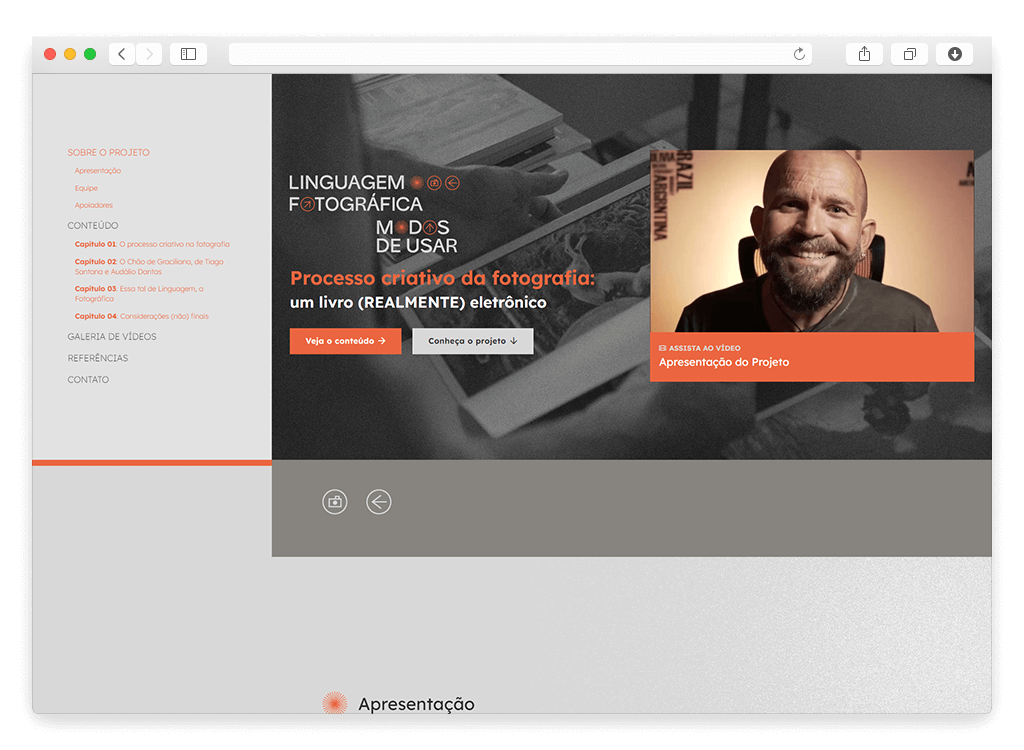 Para o projeto Linguagem Fotográfica – Modos de Usar, criamos um site de conteúdo que converte uma tese de doutorado em um “ebook” interativo, servindo de divulgação científica.