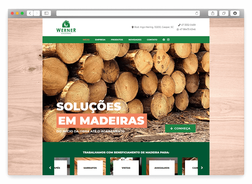 Atualização do site da Werner Madeiras, adaptado para mobile, com informações de contato e catálogo de produtos claros na página.